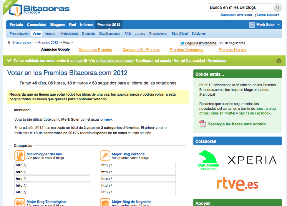 Cuarto paso: Entrar en la sección Premios 2012 / Votar